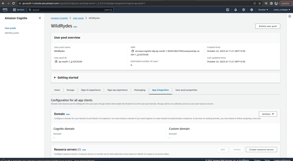 On the Integrate your app page, name your user pool: WildRydes. Under Initial app client, name the app client: WildRydesWebApp and keep the other settings as default